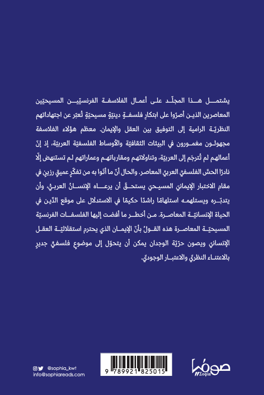 يشتمل هذا المجلّد على أعمال الفلاسفة الفرنسيّين المسيحيّين المعاصرين الذين أصرّوا على ابتكارِ فلسفةٍ دينيّةٍ مسيحيّةٍ تُعبّر عن اجتهاداتهم النظريّة الرامية إلى التوفيق بين العقل والإيمان. معظم هؤلاء الفلاسفة مجهولون مغمورون في البيئات الثقافيّة والأوساط الفلسفيّة العربيّة، إذ إنّ أعمالهم لم تُترجَم إلى العربيّة، وتناولاتهم ومقارباتهم وعماراتهم لم تستنهض إلّا نادرًا الحسَّ الفلسفيَّ العربيَّ المعاصر. والحال أنّ ما أتَوا به من تفكّرٍ عميقٍ رزينٍ في مقام الاختبار الإيمانيّ المسيحيّ يستحقّ أن يرعاه الإنسانُ العربيُّ، وأن يتدبّره ويستلهمه استلهامًا راشدًا حكيمًا في الاستدلال على موقع الدِّين في الحياة الإنسانيّة المعاصرة. من أخطر ما أفضت إليها الفلسفات الفرنسيّة المسيحيّة المعاصرة هذه القولُ بأنّ الإيمان الذي يحترم استقلاليّة العقل الإنسانيّ ويصون حرّيّة الوجدان يمكن أن يتحوّل إلى موضوعٍ فلسفيٍّ جديرٍ بالاعتناء النظريّ والاعتبار الوجوديّ.