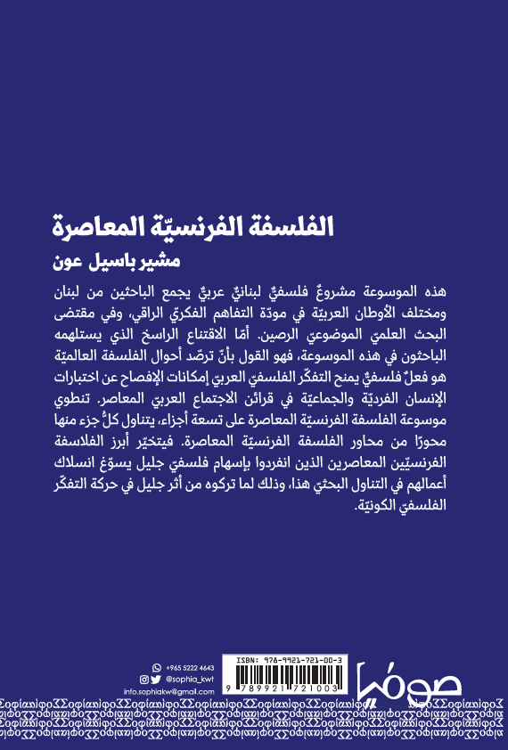 هذه الموسوعة مشروعُ فلسفيُ لبناني عربي يجمع الباحثين من لبنان ومختلف الأوطان العربية في مودة التفاهم الفكري الراقي , وفي مقتضى البحث العلمي الموضوعي الرصين . أما الاقتناع الراسخ الذي يستلهمه الباحثون في هذه الموسوعة , فهو القول بأن ترصد أحوال الفلسفة العالمية هو فعل فلسفي يمنح التفكر الفلسفي العربي إمكانات الإفصاح عن اختبارات الإنسان الفردية و الجماعية في قرائن الاجتماع العربي المعاصر . تنطوي موسوعة الفلسفة الفرنسية المعاصرة على عشرة أجزاء يتناول كل جزء منها محوراً من محاور الفلسفة الفرنسية المعاصرة . فيتخير أبرز الفلاسفة الفرنسيين المعاصرين الذين انفردوا بإسهام فلسفي جليل يسوغ انسلاك أعمالهم في التناول البحثي هذا وذلك لما تركوه من أثر جليل في حركة التفكر الفلسفي الكونية .
