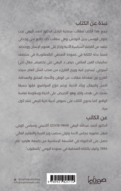 يجمع هذا الكتاب مقالات منتخبة للراحل الدكتور أحمد الربعي تحت عنوان الهمس بديل التوحش، وهي مقالات ذات طابع أدبي وجداني تبتعد عن القضايا السياسية الآنية وتركز على هموم الإنسان ووجدانه. فمنذ بدئه الكتابة في عموده الصحفي ((بالمقلوب)) في منتصف ثمانينيات القرن الماضي، حرص د. الربعي على تخصيص مقالٍ أدبيٍّ أسبوعي، ليستريح فيه ويريح القارىء من صخب الشأن العام. سيجد القارئ بين صفحاته مقالات عن الوطن والأسرة، العشق والصداقة، الأمل والجمال، ورثاء الأحبة. ورغم تنوّع المواضيع، فإنها جميعًا تشترك في هدف واحد وهو التحريض على الحياة ومقاومة تعاسة الواقع. كما يحتوي الكتاب على نصوص أدبية نثرية للربعي تنشر لأول مرة.