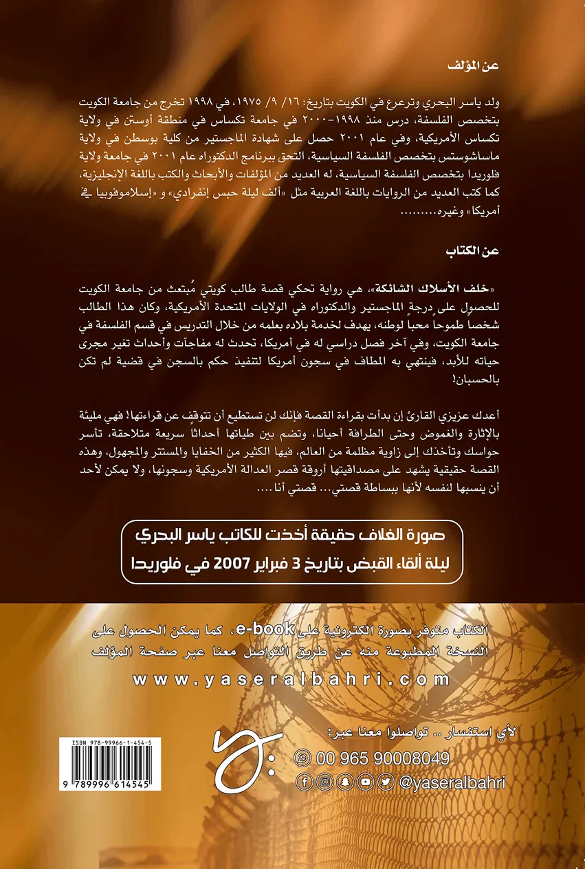 خلف الأسلاك الشائكة هي رواية تحكي قصة طالب كويتي مبتعث من جامعة الكويت للحصول على درجة الماجستير و الدكتوراه في الولايات المتحدة الأمريكية ، وكان هذا الطالب شخصاً طموحاً محباً لوطنه ، يهدف لخدمة بلاده بعلمه من خلال التدريس في قسم الفلسفة في جامعة الكويت ، و في اخر فصل دراسي له في أمريكا ، تحدث له مفاجأت و احداث تغير مجرى حياته للأبد ، فينتهي به المطاف في سجون أمريكا لتنفيذ حكم بالسجن في قضية لم تكن بالحسبان